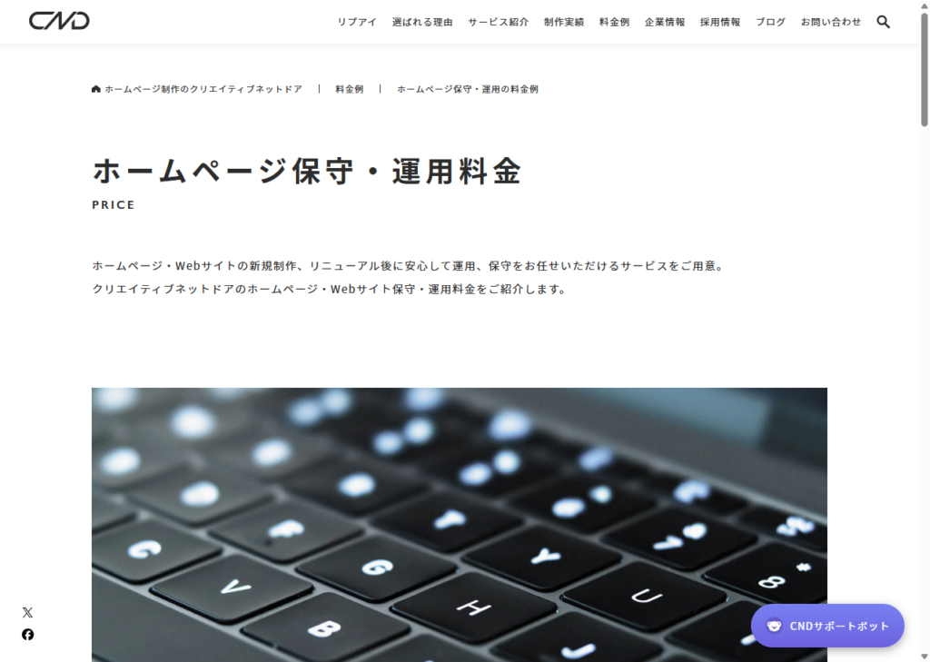 クリエイティブネットドアは、WordPressサイトの保守運用サービスを料金目安付きで提供しています。更新頻度が高め・機能要件が多めの中規模以上サイトに適しています。