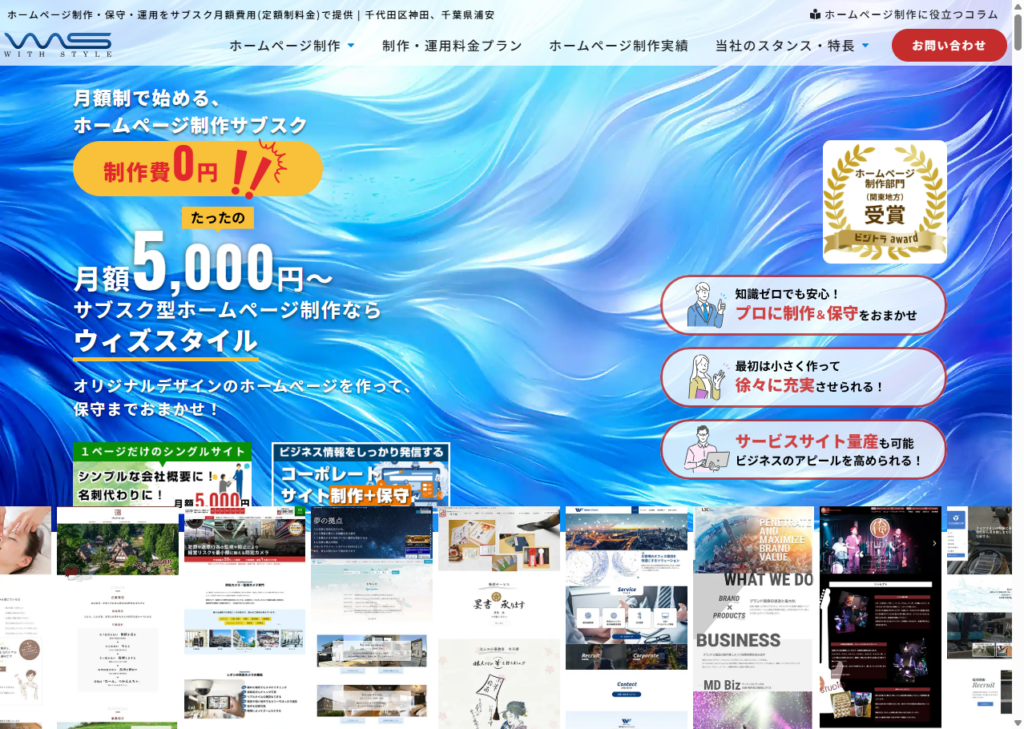 ウィズスタイルは、東京都千代田区神田多町にオフィスを構え、Webサイトの企画・制作・運用・保守を月額定額制(サブスク型)で提供している会社です。制作費0円・月額固定プランを明示しており、公開後の運用・保守フェーズを含めたトータル支援に力を入れています。全国対応としながらも東京都心拠点という相談しやすさも特徴です。Webマーケティング・更新代行・保守サポートを包括しており、更新頻度が高くない中小規模サイトでも安心して任せられる運用モデルです。