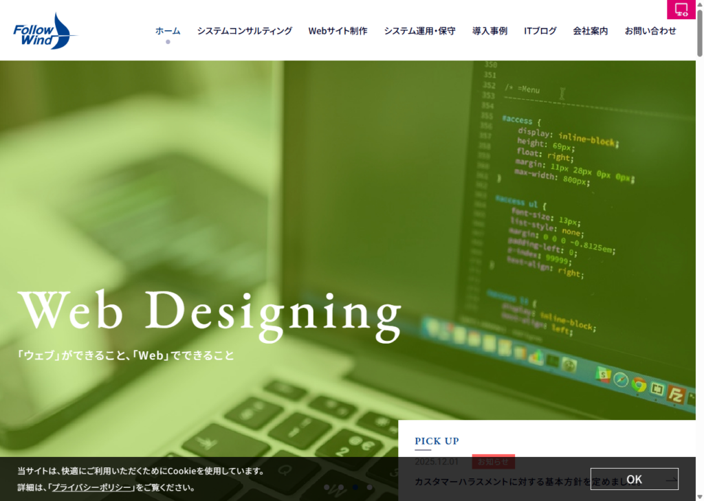 フォローウインドは、制作から保守運用までワンストップで対応可能な会社です。更新、トラブル対応、アクセス解析レポート提供など総合的に支援します。