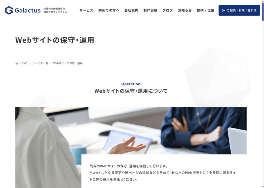 合同会社ギャラクタスは、大阪市阿倍野区を拠点に、Webサイトの保守・運用を中心としたサポートを提供する制作会社です。既存サイトの安定稼働を維持するための保守業務から、継続的な更新・改善対応まで幅広く支援しています。WordPressを中心としたCMSアップデート、バックアップ対応、セキュリティ対策、軽微な修正作業など、日常的に発生する運用業務を包括的にカバーしています。