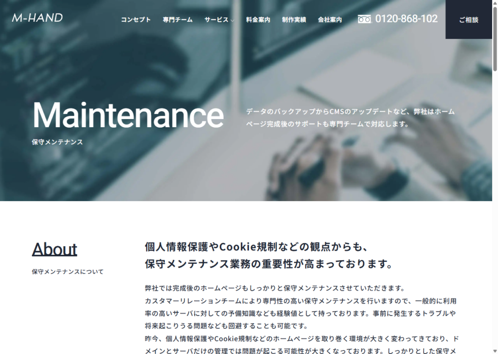 | 株式会社エムハンド | Webサイト制作・保守メンテナンス・更新代行・アクセス解析・Webマーケティング支援 | 月額16,500円〜(保守メンテナンス:Plan a) | 中小〜大規模サイトまで対応可能、柔軟なプラン設定と業種特化型サポート |